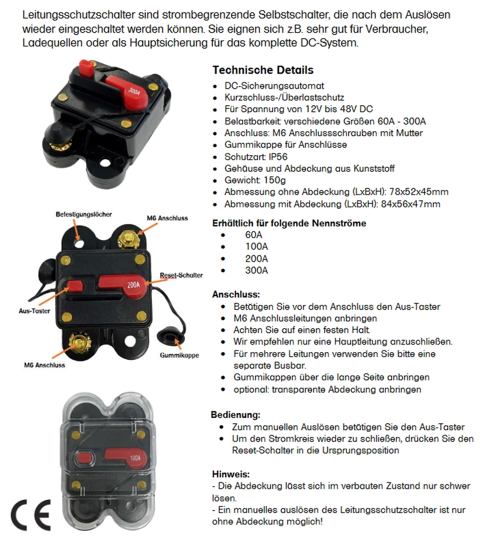 Die Leitungsschutzschalter von Offgridtec sind ein wichtiger Bestandteil jeder Elektroinstallation. Die Schalter verhindern, dass Stromspitzen Ihre Geräte beschädigen. Mit dem praktischen und langlebigen transparenten Deckel entspricht der Schalter der Schutzklasse IP56 und ist somit auch für den Einsatz im marinen Bereich geeignet. Aber auch für Installationen im Wohnmobil, Bus und vielen weiteren Bereichen ist der Schutzschalter eine gute Wahl.