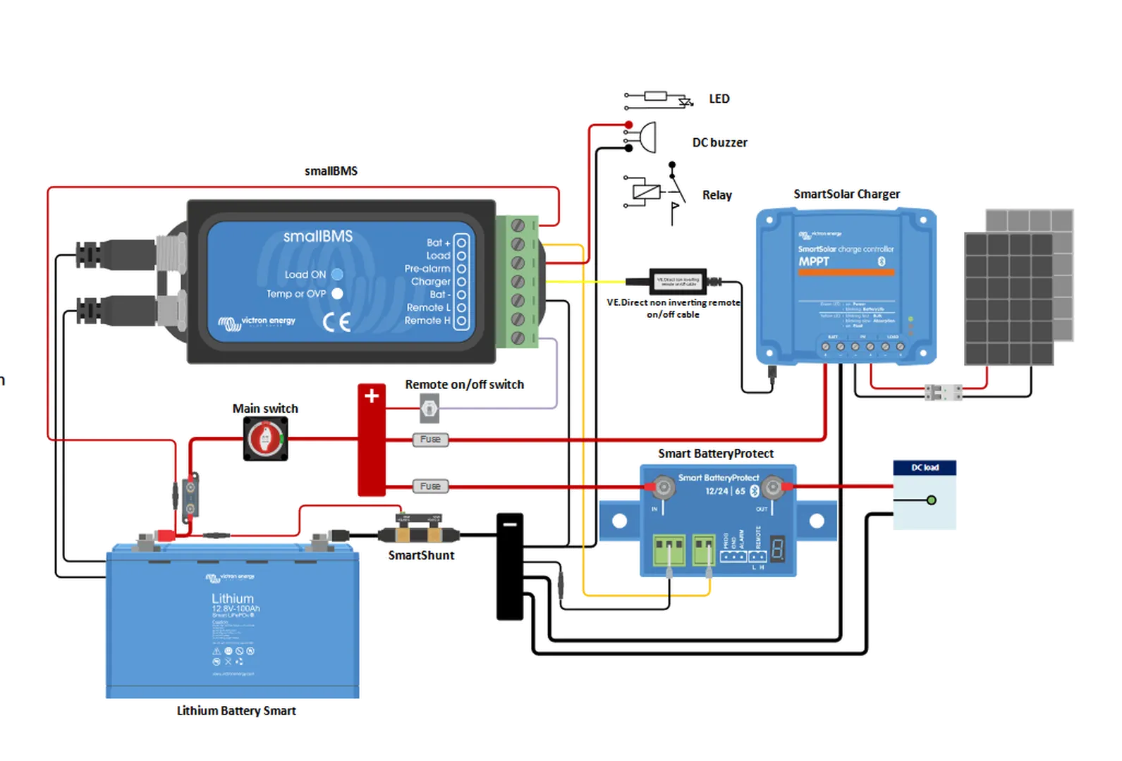 Das Victron Mini (small) BMS mit Voralarm ist ein komplettes Batteriemanagementsystem (BMS) für Victron Energy Lithium Battery Smart-Batterien. Bei diesen Batterien handelt es sich um Lithium-Eisenphosphat-Batterien (LiFePO4), die in den Spannungen 12,8 V oder 25,6 V und in verschiedenen Kapazitäten erhältlich sind. Sie können in Reihe, parallel und sowohl in Reihe als auch parallel geschaltet werden, sodass eine Batteriebank für Systemspannungen von 12 V, 24 V oder 48 V ausgelegt werden kann. Die maximale Anzahl von Batterien in einem System beträgt 20, was zu einem maximalen Energiespeicher von 84 kWh in einem 12 V-System und bis zu 102 kWh in einem 24 V 1) - und 48 V1) - System führt. Das smallBMS ist eine einfache und kostengünstige Alternative zum VE.Bus BMS, verfügt aber nicht über eine VE.Bus Schnittstelle und ist daher nicht für die Verwendung mit VE.Bus MultiPlus und Quattro Wechselstromgeneratoren/Ladegeräten geeignet.