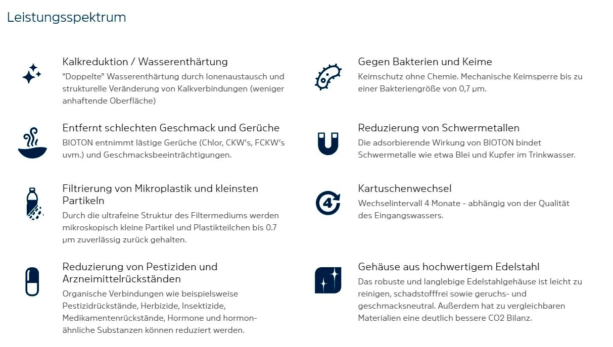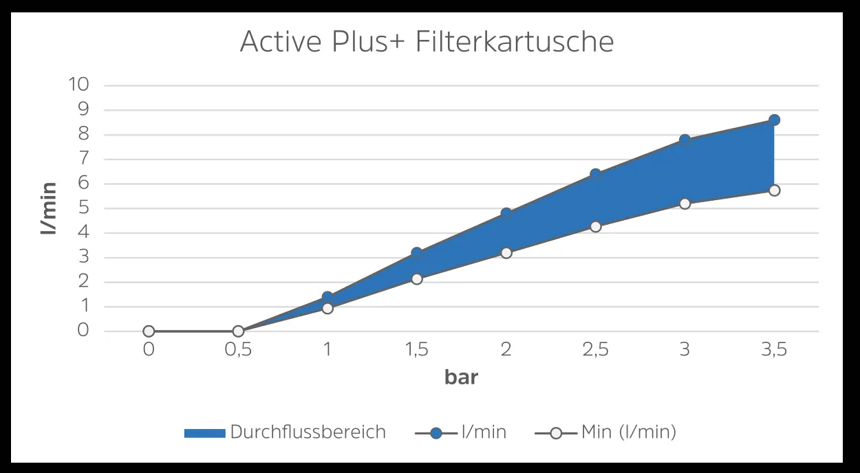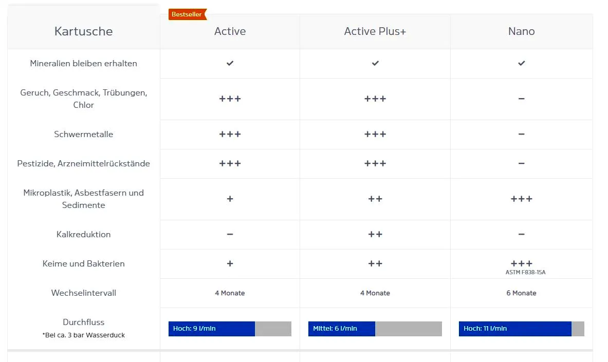 Die Active Plus+ Kartusche hat ähnliche Leistungsparameter wie die Standard Active Variante, ist jedoch zusätzlich in der Lage eine Vielzahl von Bakterien zu filtern. Ein weiterer Pluspunkt ist die Reduktion von Kalk (Wasserenthärtung). Weitere Leistungen der Kartusche sind eine Filtration/Reduktion von: Geruch, Geschmack, Trübung, Chlor, Pestizide, Mikroplastik u.v.m.