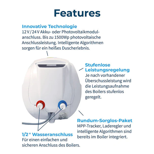 - Intelligenter Akkubetrieb: Nutzung überschüssiger Energie aus einem 12V/24V Akku zur Heizung des Wassers