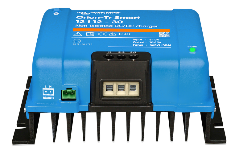 Das Victron Orion-TR Smart Batterieladegerät ist ein speziell entwickelter DC-DC-Umwandler für ein kontrolliertes Laden oder für einen festen Ausgangsmodus. Der dreiphasige Ladealgorithmus des Orion verlängert die Lebensdauer der Batterie, indem er sie richtig auflädt. Dies ist besonders wichtig bei Fahrzeugen mit einer intelligenten Lichtmaschine oder einem Spannungsverlust aufgrund von langen Kabeln. Zudem schützt die kontrollierte Aufladung die Lichtmaschine in Lithiumsystemen. In dem festen Ausgangsmodus bleibt die Ausgangsspannung stabil, unabhängig von der angelegten Last oder der variierenden Eingangsspannung.