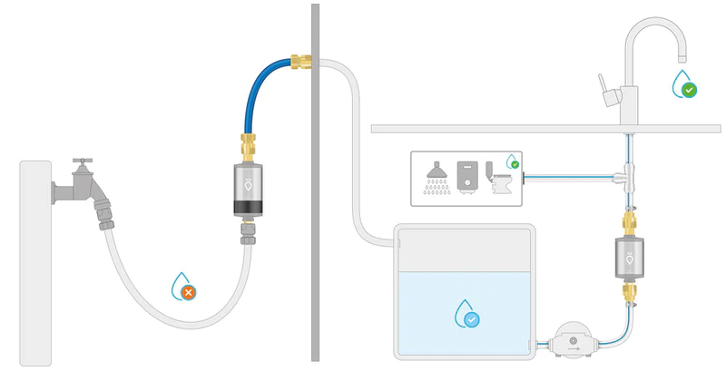 So macht man es richtig! Bei größeren Wassertanks ab 120 Liter ist es sinnvoll, die Wasseraufbereitung in einer Kombination aus Betankung von außen sowie mit einem Festeinbau nach dem Wassertank zu realisieren. Hierbei werden mit unserem Alb Filter Active und Protect Vorfilter von außen jene Stoffe gefiltert, die sich nicht mehr reproduzieren lassen. Ergänzend verbauen wir dann die Alb Filter Nano - Keimsperre nach dem Wassertank um sich vor einer möglichen Verkeimung durch Krankheitserreger bzw. Bakterien im Wassertank zu schützen.